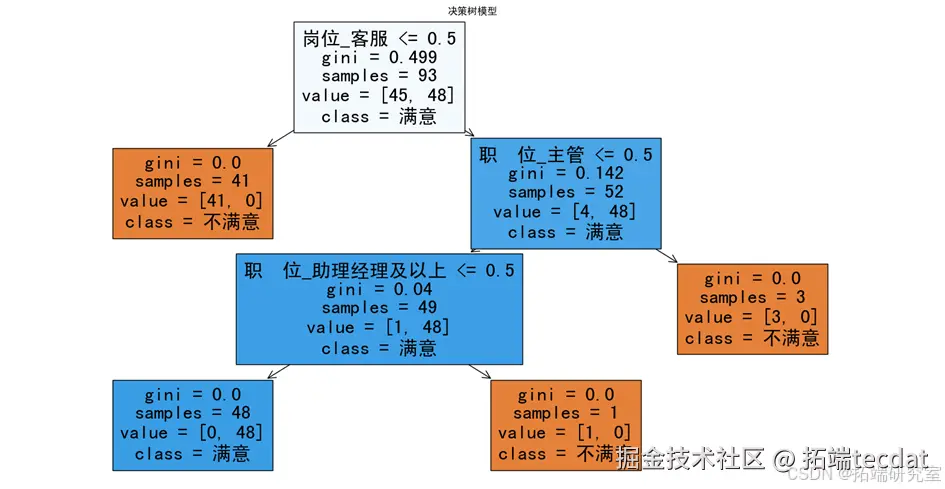 - 根据提供的图像,我们可以看到“岗位_客服”、“职位_主管”和“职位_助理经理及以上”是决策树中用于预测满意度的关键特征。