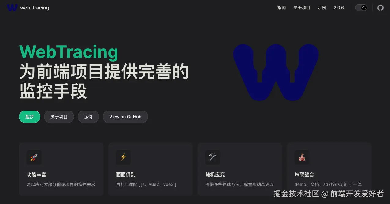 xy👨🏻💻。今天给大家推荐一款前端监控工具——WebTracing,专为前端项目提供埋点、行为、性能、异常、请求、资源、路由、曝光、录屏等监控手段!