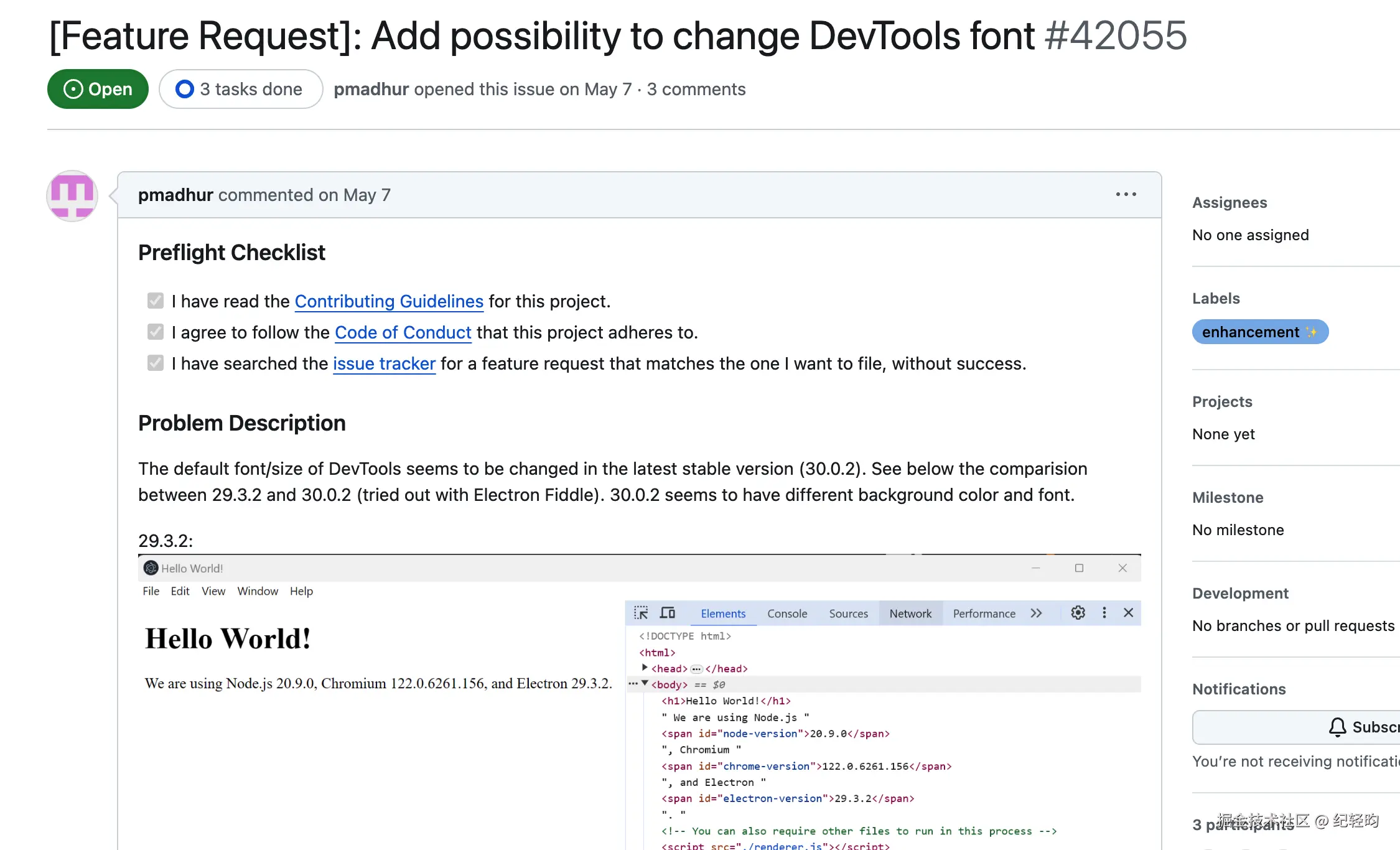 简单来说,作者对比了Electron在29.3.2和30.0.2的差异,觉得现在的 UI 太丑了,忍不住提了个需求,希望能类似于 BrowserView WebPreferences 中的 defaultFontFamily 和 defaultFontSize,添加 defaultDevToolsFontFamily 和 defaultDevToolsFontSize。或者在 webContents 中添加一个方法来设置默认字体/字号。