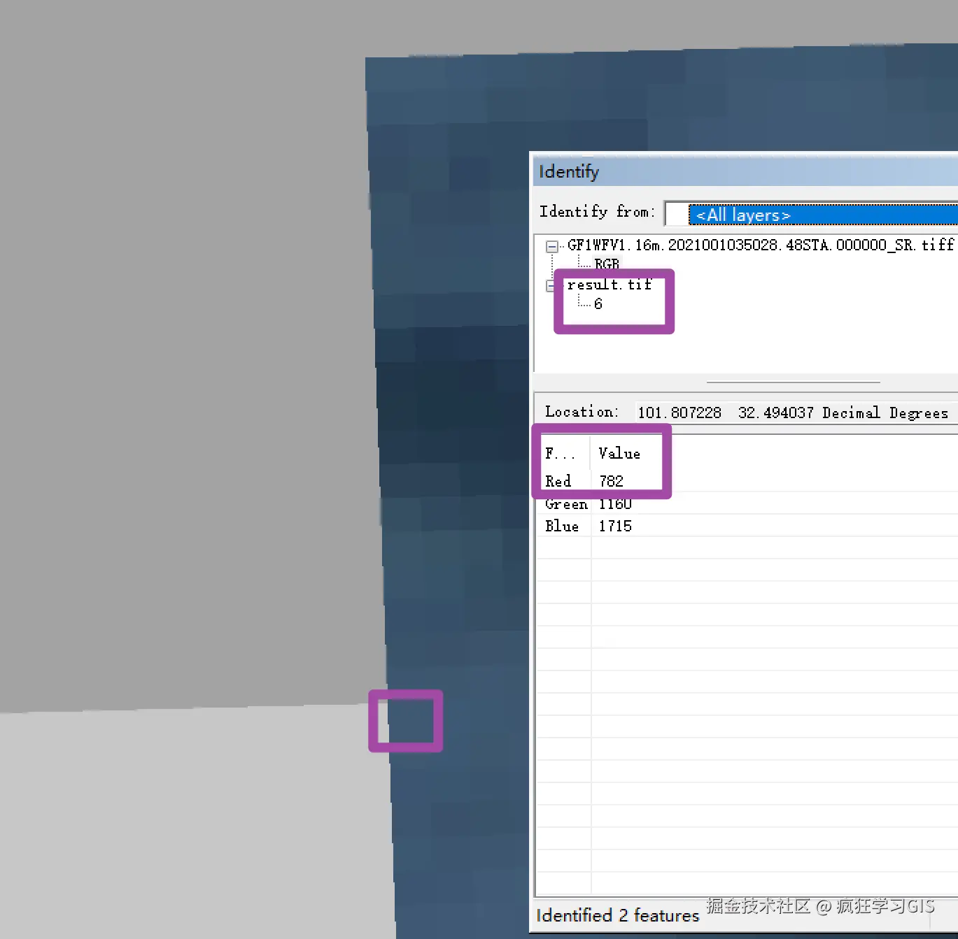 我们到ArcGIS中验证一下,将小遥感影像从左上角开始,向下数20行,可以看到对应的像元(如下图中左下角的紫色框内所示)确实位于大遥感影像像元的分界处,且二者的像素值也都和上图中2个二维数组所示的一致。