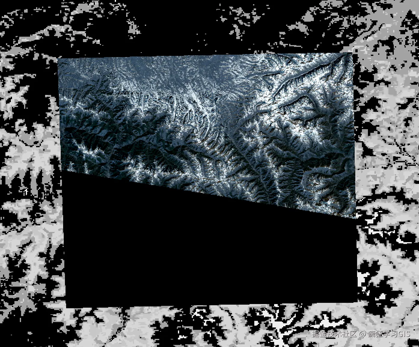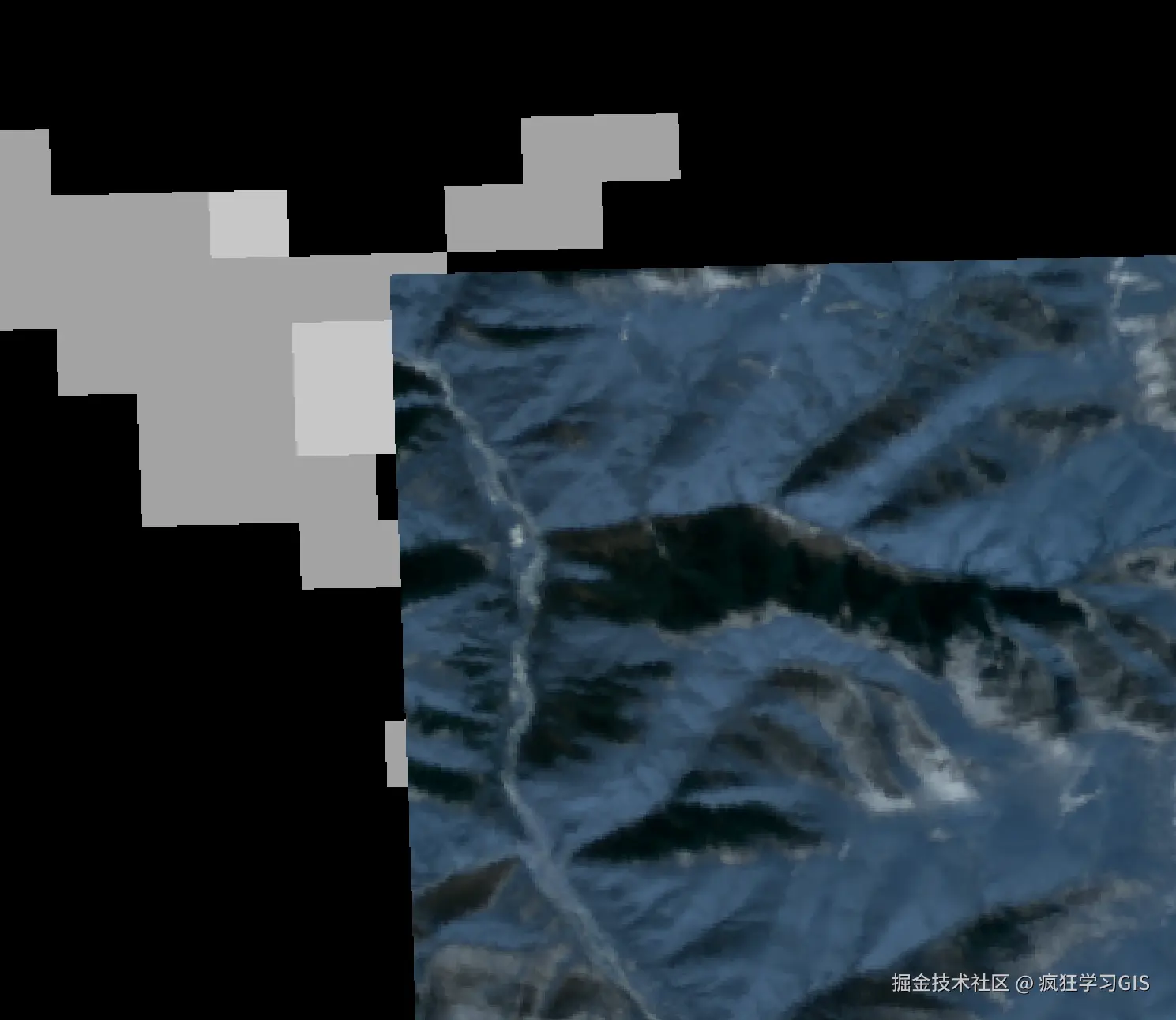 首先,明确一下本文的需求。现在有2景成像范围不完全一致、但是具有重叠部分的遥感影像,如下图所示;我们就将其称作大遥感影像(成像范围更大的、灰色系的那一景遥感影像)和小遥感影像(成像范围更小的、蓝色系的那一景遥感影像)。这2景遥感影像的成像范围、空间分辨率、空间坐标系等都不一致(当然,也可以一致;而且如果一致的话,后续处理起来也会更方便理解一些)。