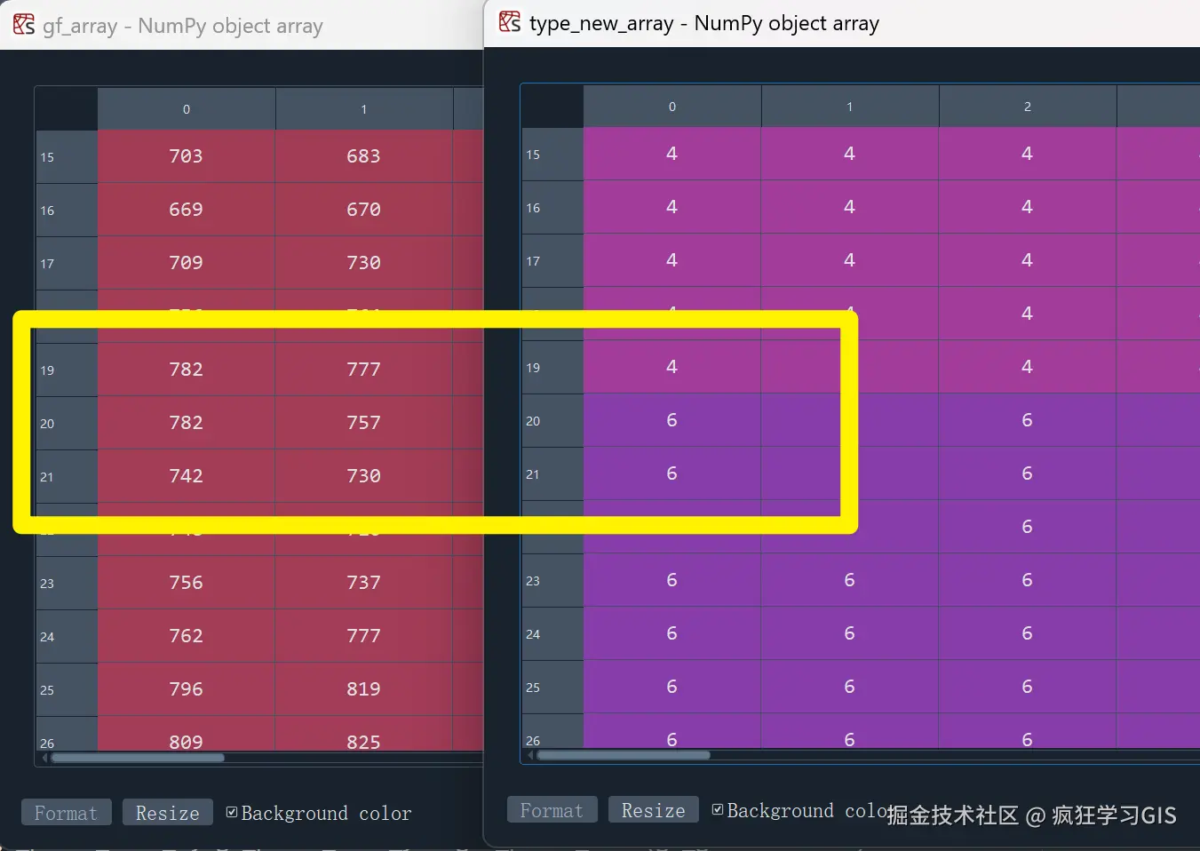 执行上述代码后,我们来检查一下代码的运行是否符合预期。因为大遥感影像的空间分辨率低一些,所以我们就用它来验证我们的结果(空间分辨率低一些的话,验证起来反而更方便)。首先,如下图所示,可以看到,我们的代码结果(也就是type_new_array这个数组)显示,当行号为19与20时,其像素值发生了变化。