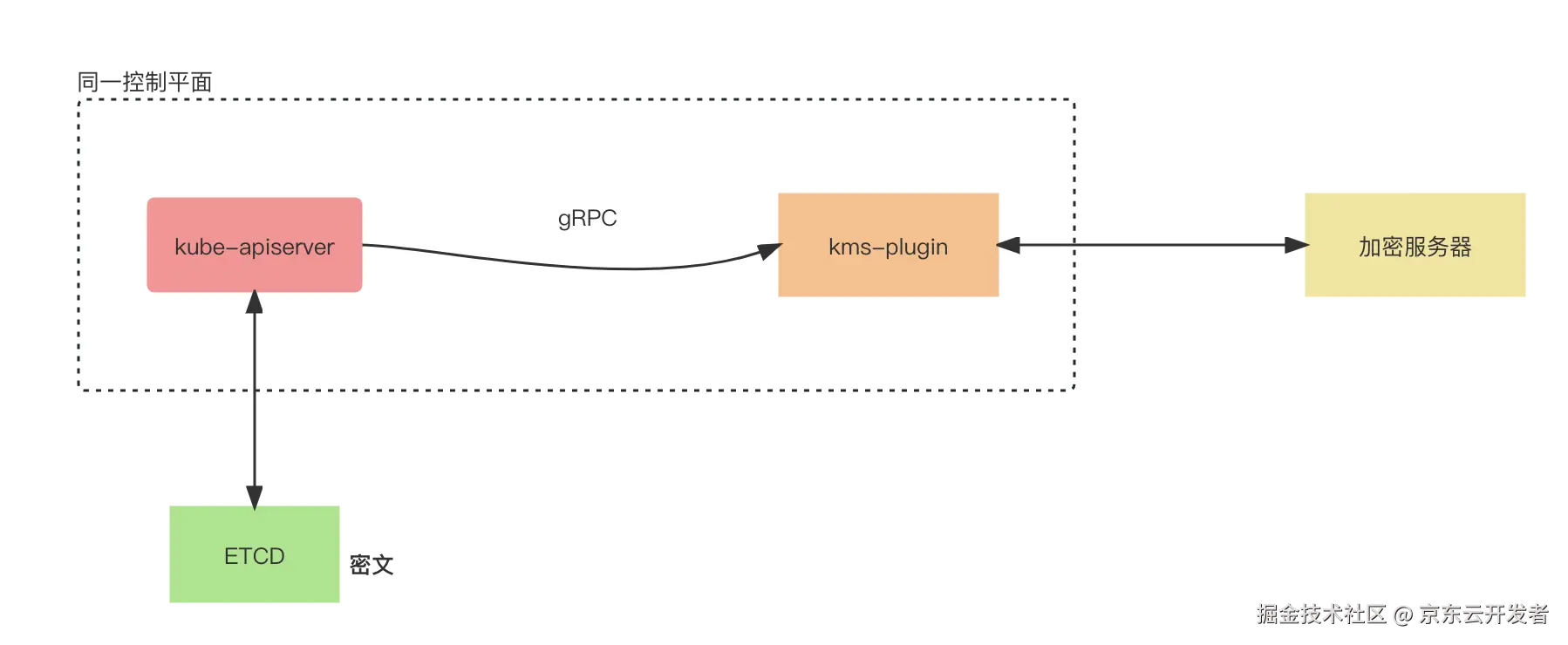 当用户新建secret资源时,kube-apiserver 会通过gRPC调用kms-plugin,而kms-plugin与加密服务器通信,进行数据加密。