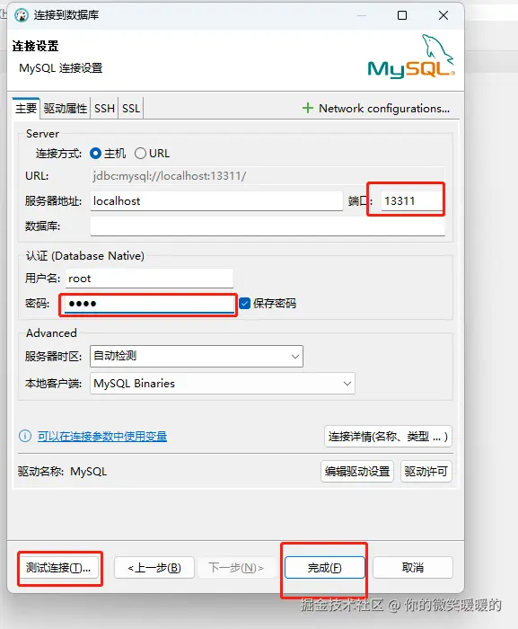 注意:这个端口,它默认是3306,但是我们上面写的那个容器配置,是映射到13311的(主要是我电脑会开很多mysql配置,所以我就重新映射了端口),密码也是我们上面自己写的那个密码,点击测试,没问题就点击完成。