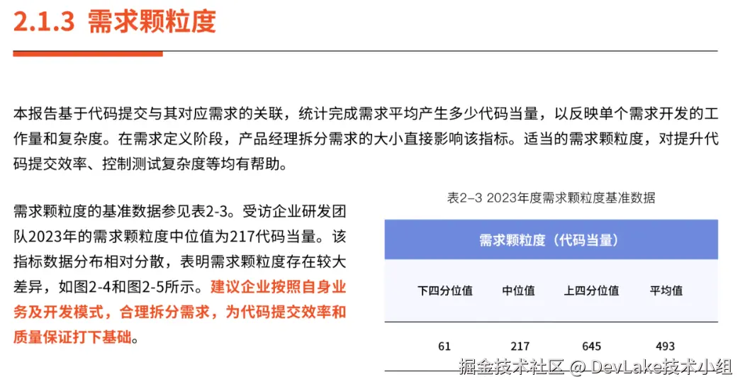 - 需求颗粒度: 受访企业研发团队2023年的需求颗粒度中位值为217代码当量。该指标数据分布相对分散,表明需求颗粒度存在较大差异。建议企业按照自身业务及开发模式,合理拆分需求,为代码提交效率和质量保证打下基础。