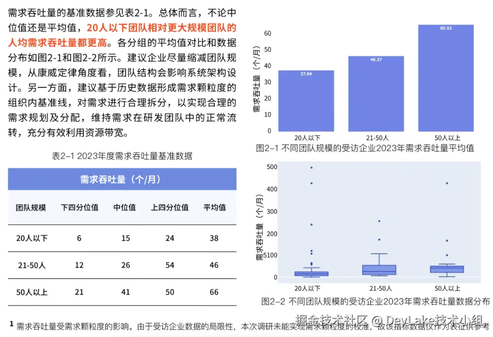 - 需求 吞吐量 :不论中位值还是平均值,20人以下团队相对更大规模团队的人均需求吞吐量都更高。建议企业尽量缩减团队规模,从康威定律角度看,团队结构会影响系统架构设计。另一方面,建议基于历史数据形成需求颗粒度的组织内基准线,对需求进行合理拆分,以实现合理的需求规划及分配,维持需求在研发团队中的正常流转,充分有效利用资源带宽。