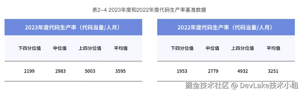 - 代码生产率: 受访企业研发团队2023年的代码生产率相较于2022年稳中有升,中位值上升7.3%,平均值上升10.6% 。代码生产率受多种因素的综合影响,企业研发团队应从流程体系、工具平台、系统架构等多角度审视,找到可行动的改进项,快速实践并通过数据获得反馈。
