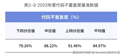 - 代码不重复度:受访企业研发团队2023年代码不重复度的中位值为88% 。对于项目代码中重复或相似的逻辑,建议研发团队将其抽象成函数或者可以公用的基类,以增加代码的可读性和可维护性。
