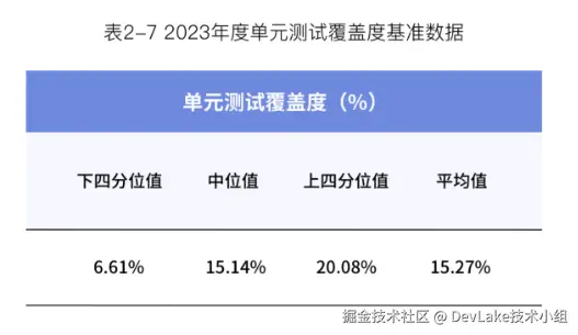 - 单元测试覆盖度:受访企业研发团队2023年单元测试覆盖度中位值仅为15%,提示该指标仍有较大提升空间。提升单元测试覆盖度,可以提高代码内建质量,减少维护成本,降低软件重构带来的风险;同时会增加研发团队成员的工作量,需平衡投入产出比。建议企业研发团队有的放矢,加强核心函数、复杂函数的单元测试覆盖;而对项目整体,则需关注交付效率等其他指标,实现综合收益的最大化。