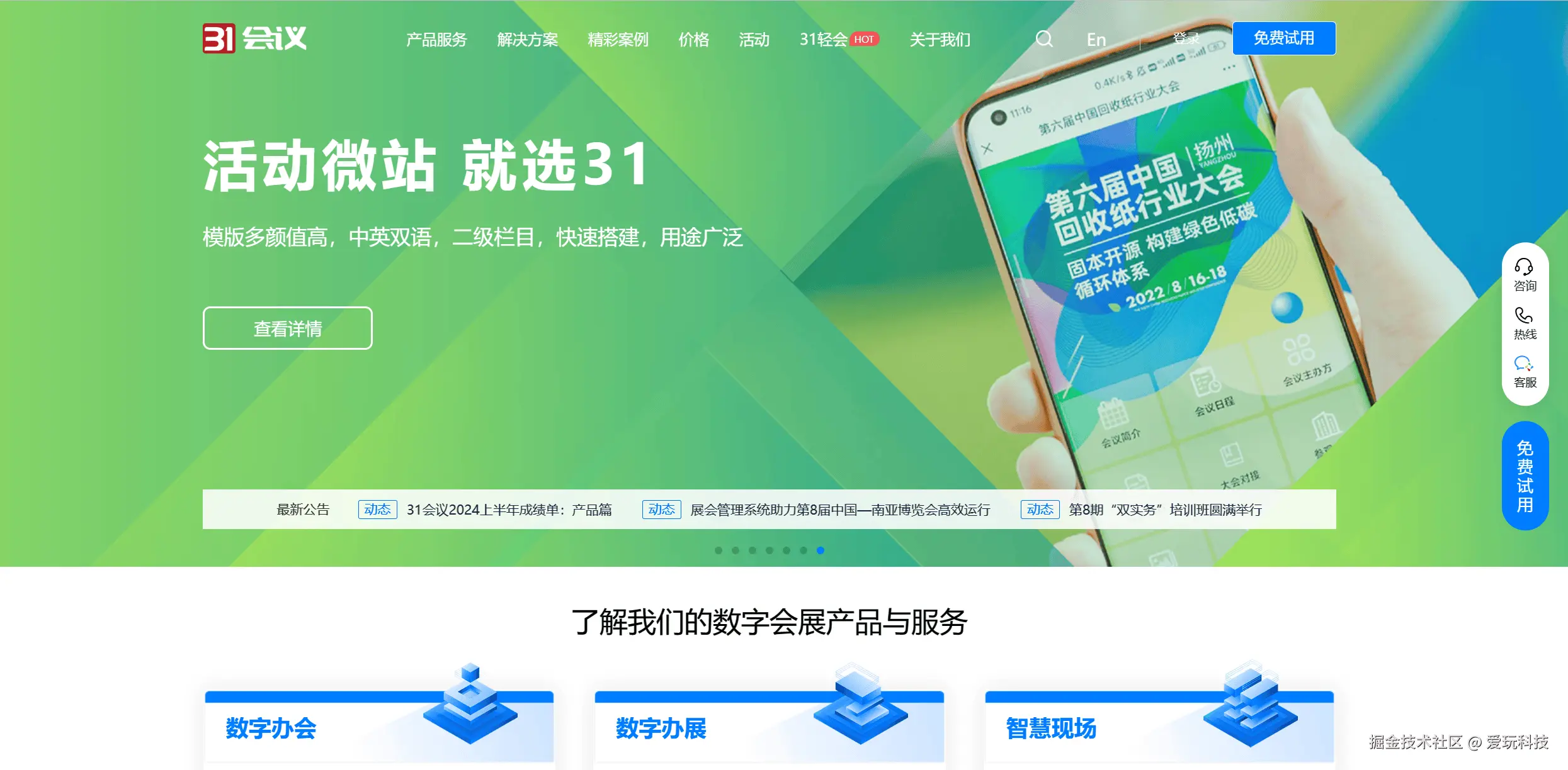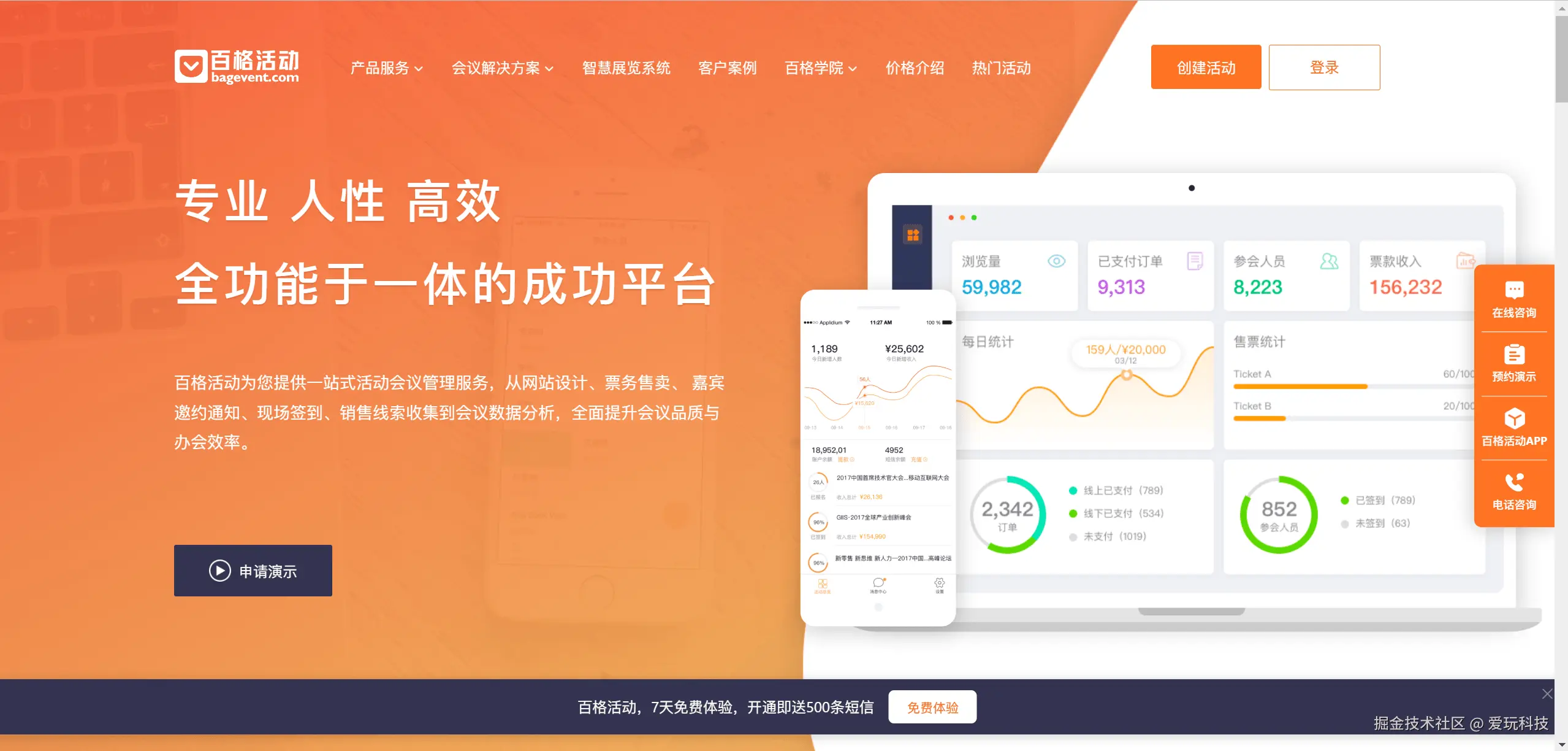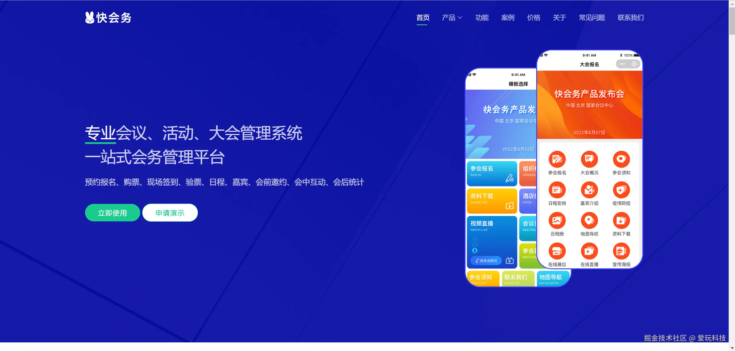 以SaaS系统为基础,一站式解决网站设计、票务售卖、通知、现场签到、销售线索收集、到会议数据分析等问题。网站提供了多种模板,可以快速生成展示网站、手机微站、小程序,PC移动内容同步更新。同时提供了渠道推广、销售推广等功能。基于具体的场景按年收费,4999-5万元不等,并提供线下培训。