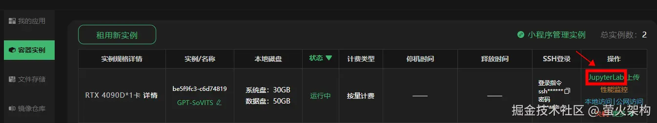 容器实例启动后,点击对应实例的 “JupyterLab”。