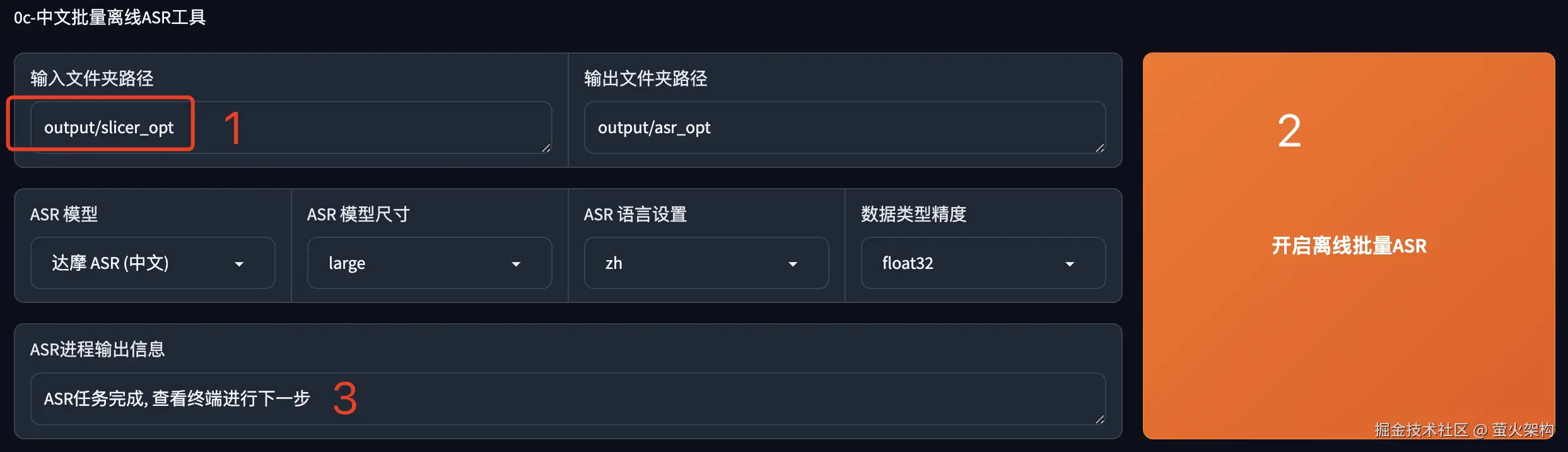 打标:生成语音对应的文字,用于后续训练时学习声音和文字的关系。输入文件夹路径默认就行,除非自定义。