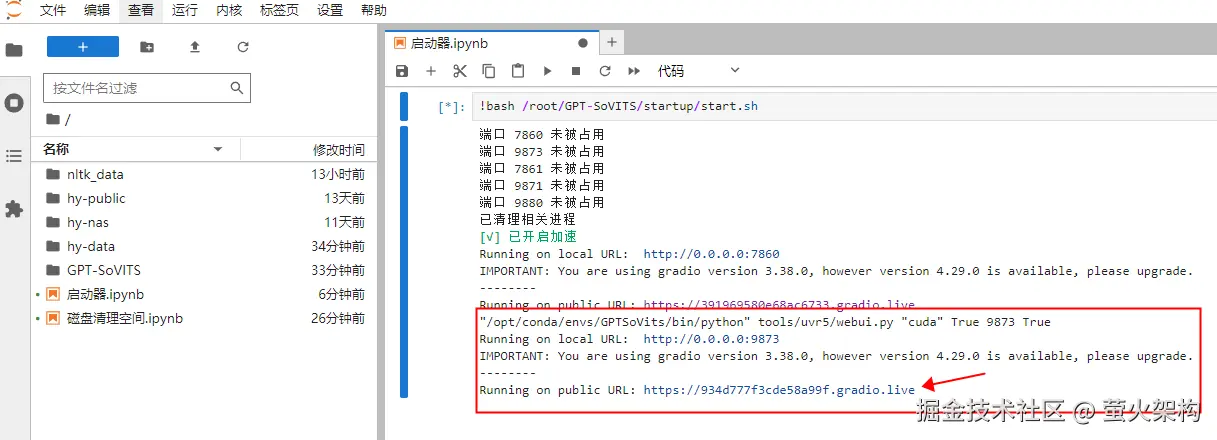 在 JupyterLab 控制台获取 UVR5 的访问地址,可以直接点击。