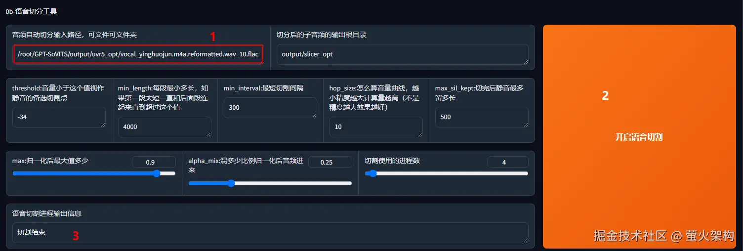 这里需要先填写声音文件在服务器中的路径,可以通过 JupyterLab 上传,或者复制上一步 UVR5 处理后的声音文件路径。