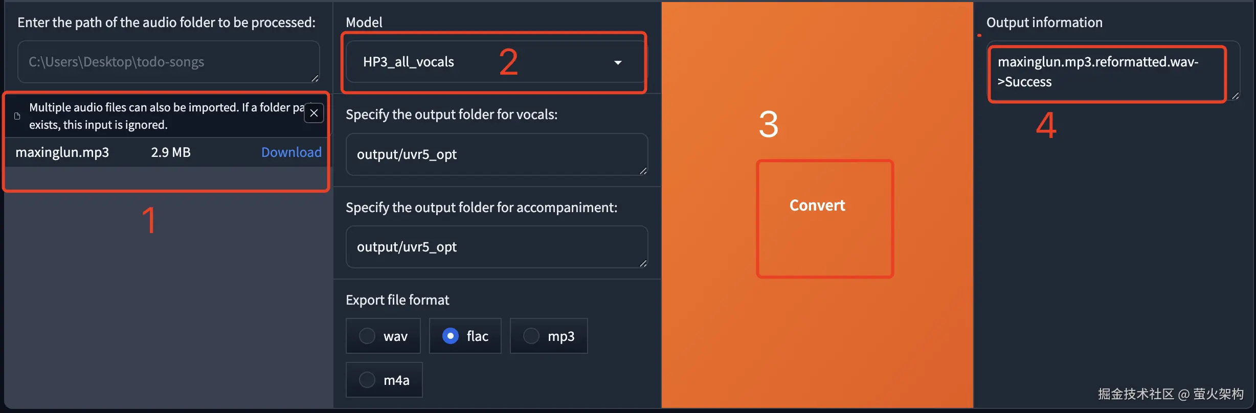 启动UVR5,人声去伴奏、混响、延迟。如果声音比较干净,质量较好,可以跳过这一步。