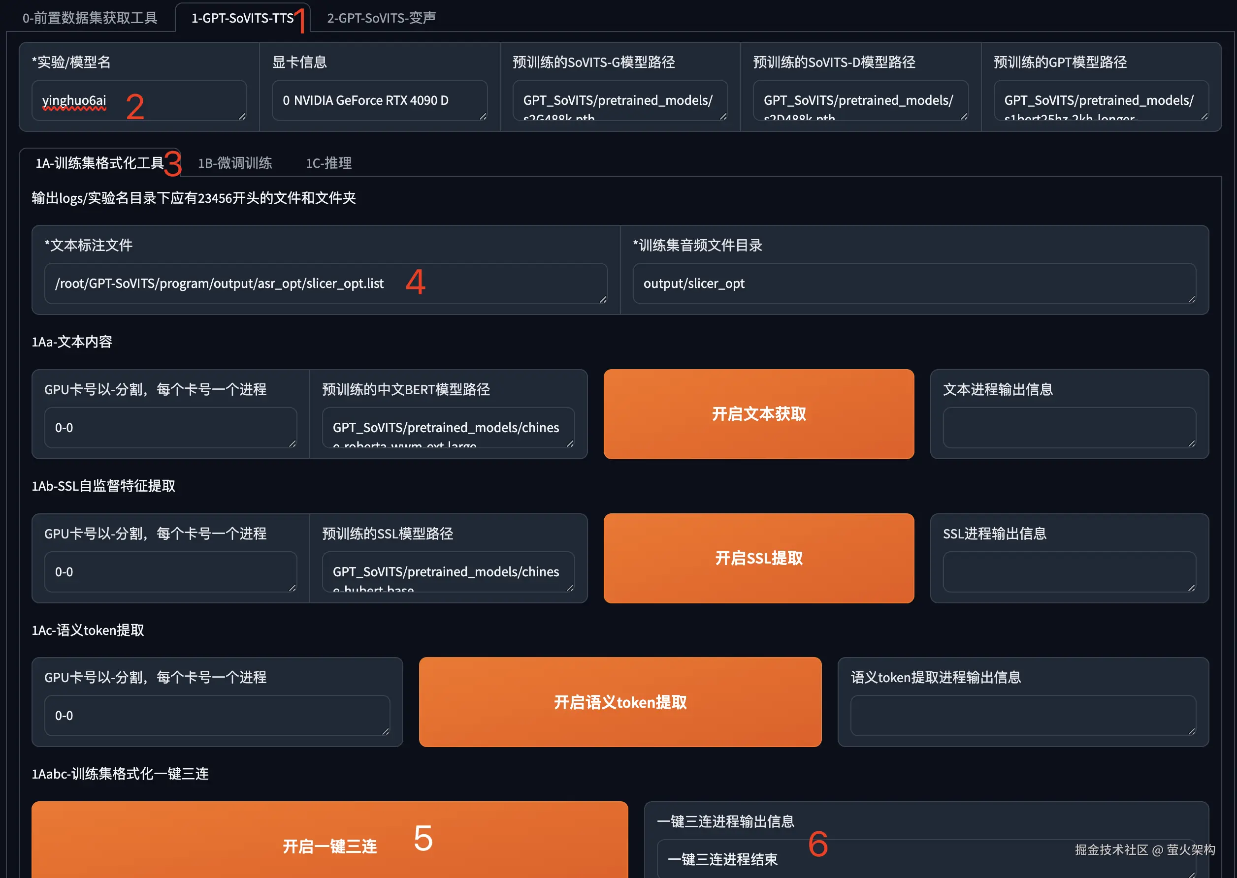 进入 “1-GPT-SoVITS-TTS” -> “1A-训练集格式化工具” 页签,填写将要生成的语音模型名称,“文本标注文件”将自动填充(除非自定义),最后点击“开启一键三连”,完成训练集数据的格式化。