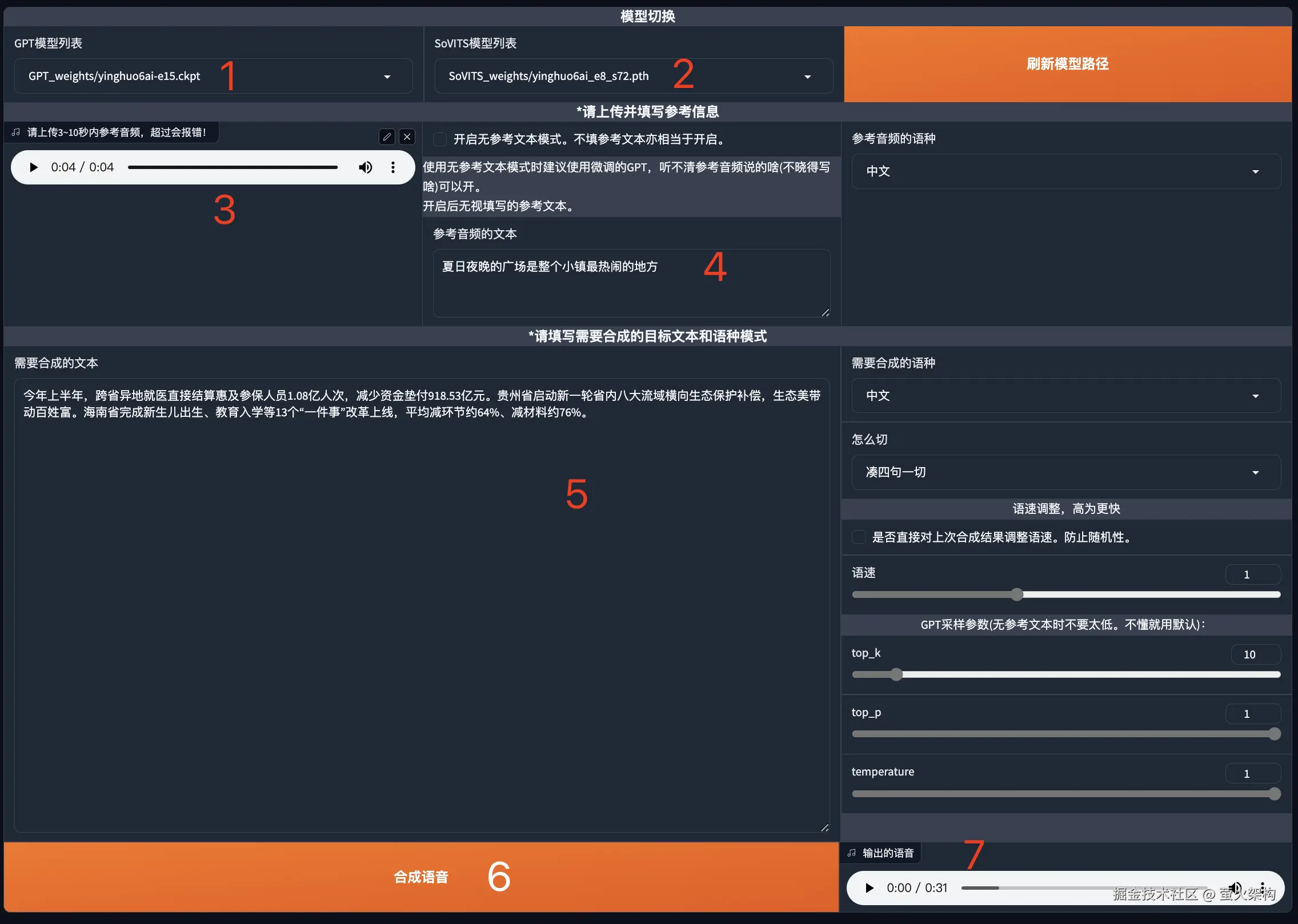 - 然后从原始训练的语音中截取一段大约5秒的音频作为参考声音,同时把这句话对应的文字填写到“参考音频的文本”中,这会影响合成语音的语调语气。
