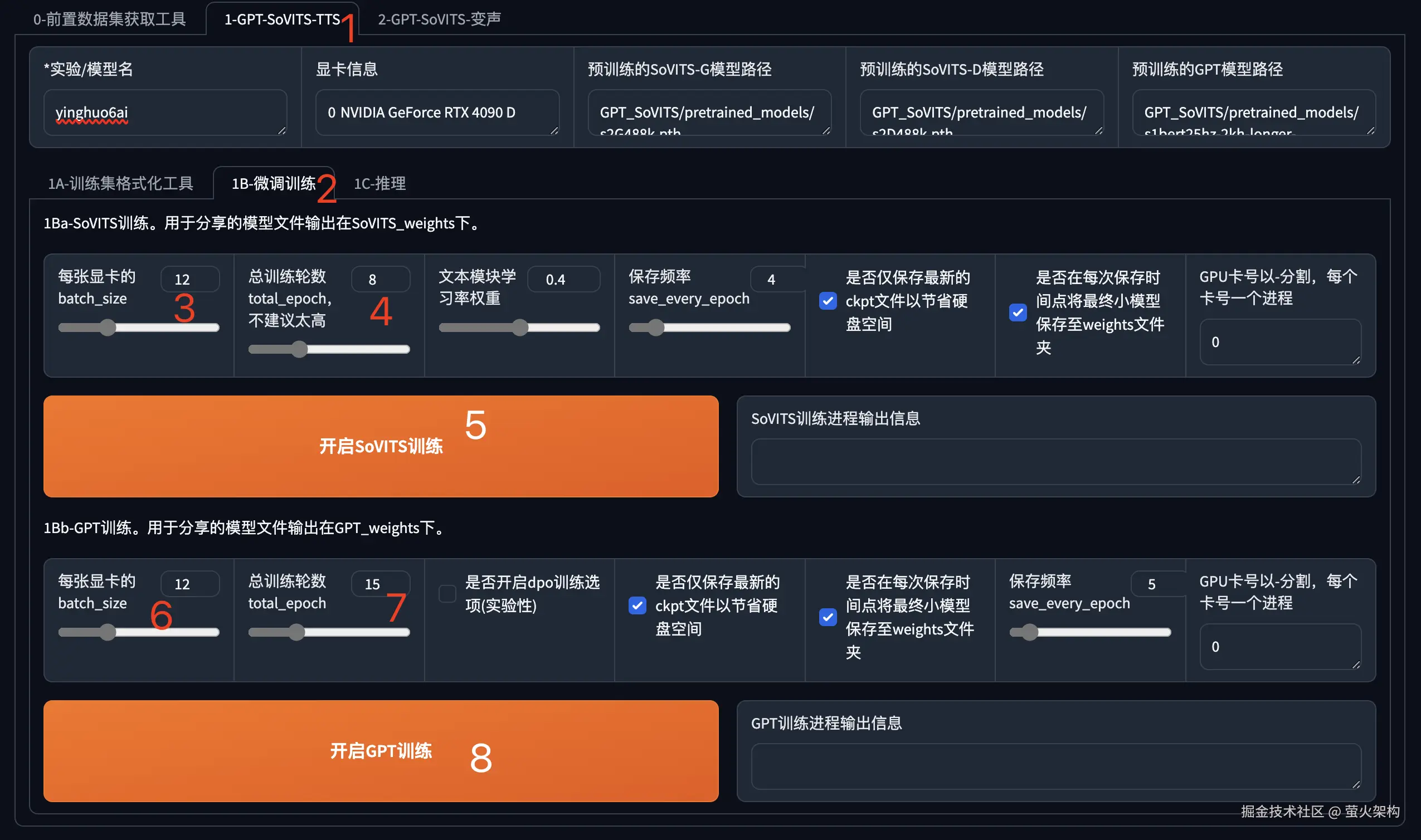 进入“1B-微调训练”,训练自己需要的语音模型。这一步是在基础语音模型的基础上训练微调模型。