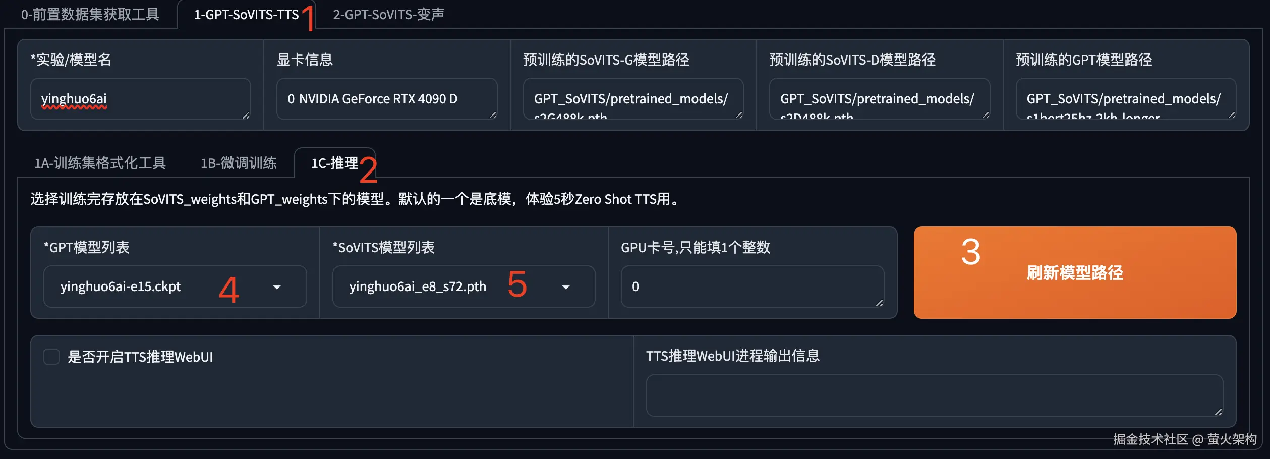 进入“1C-推理”页签,刷新模型路径,可以在4和5中看到新生成的模型/