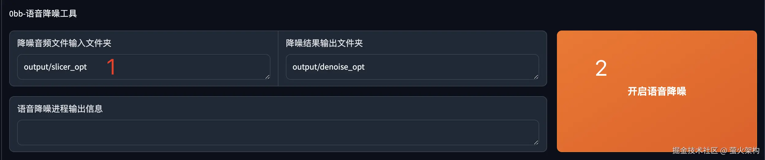 去噪:可选步骤,如果语音中的噪音比较多。输入文件夹路径默认就行,除非自定义。
