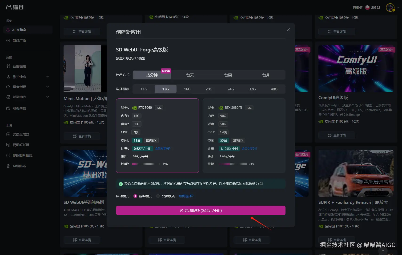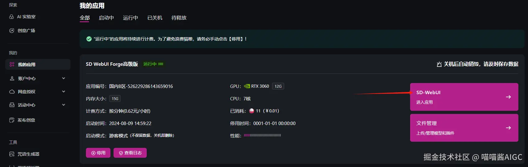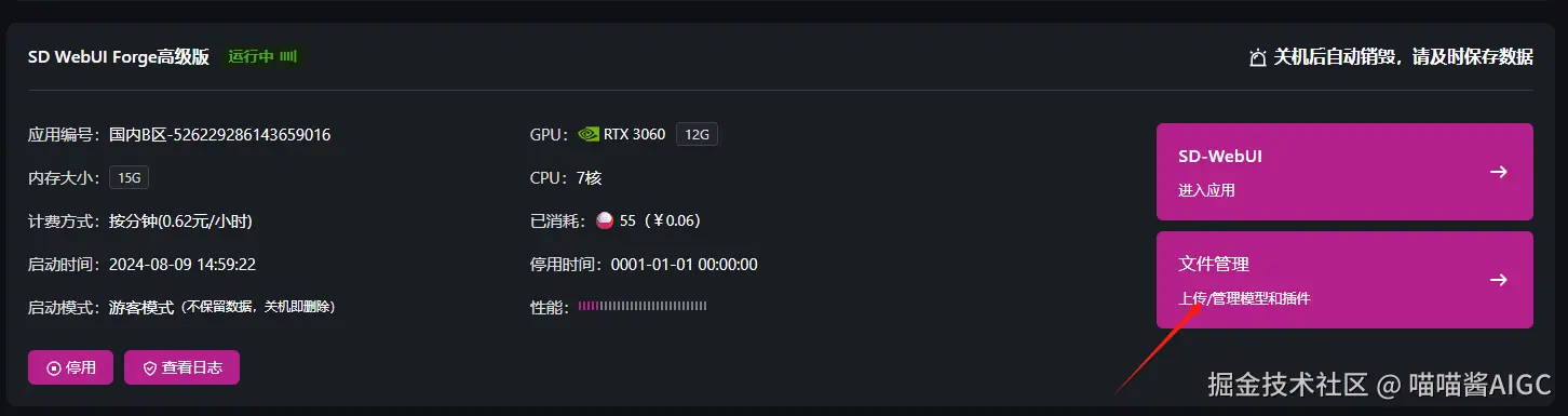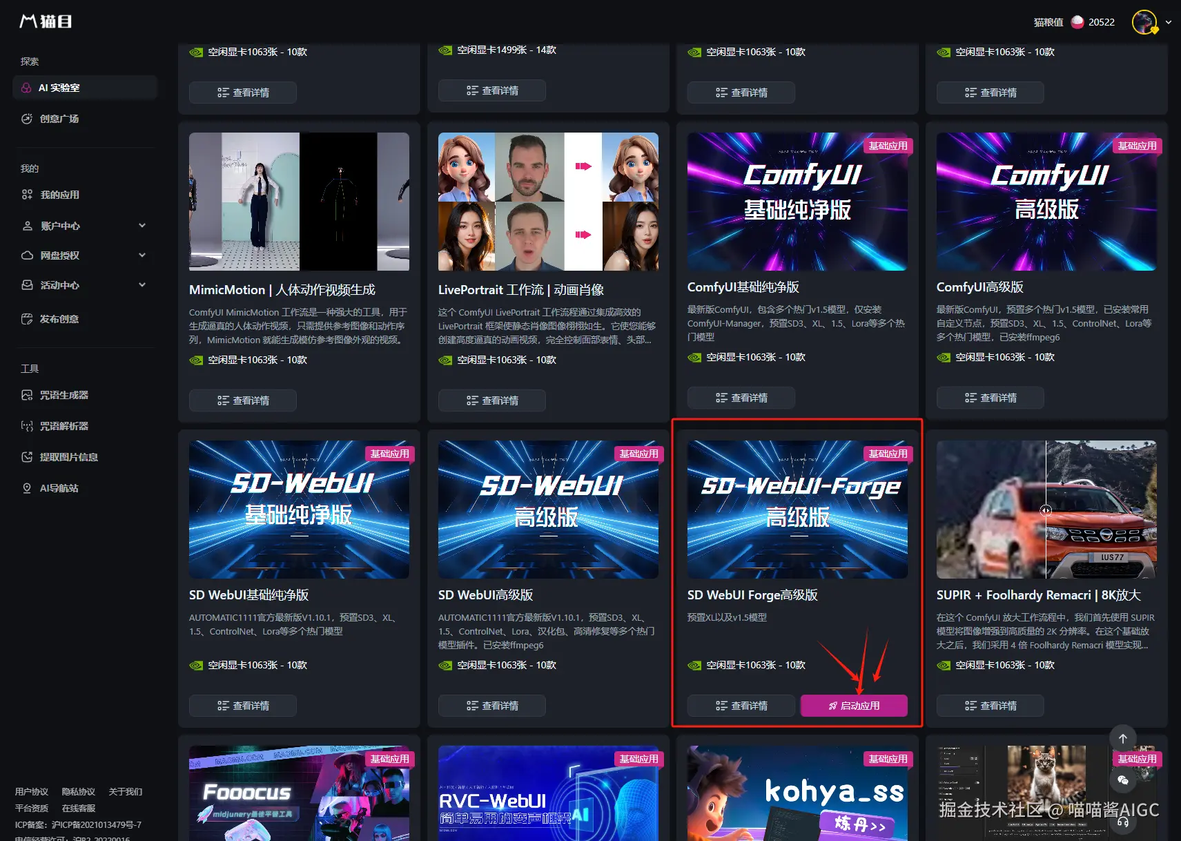 猫目平台已经上线了Stable Diffusion WebUI Forge应用,应用内预置XL以及v1.5模型,和各种ControlNet和插件等,创作者可以直接启动使用。