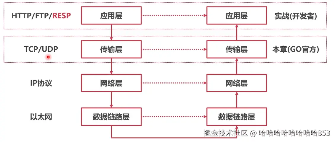 这样也是教科书式基本的分层模型,但是会有更生动的现代应用例子对应。应用层实际上是开发者使用的一些协议,而传输层是更基础的通信协议,如果需要更高的性能,则需要利用从tcp工具开始编写。