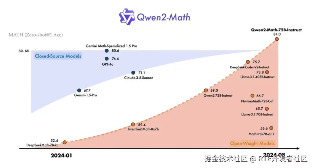 阿里通义千问 Qwen2 开源家族迎来新成员 Qwen2-Math,共有 15 亿参数、70 亿参数和 720 亿参数三个版本,是基于 Qwen2 LLM 构建、专门用于数学解题的语言模型,其数学能力显著超越了开源模型,甚至超过了闭源模型(如 GPT-4o),官方希望为科学界解决需要复杂多步逻辑推理的高级数学问题做出贡献。