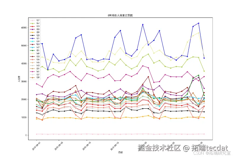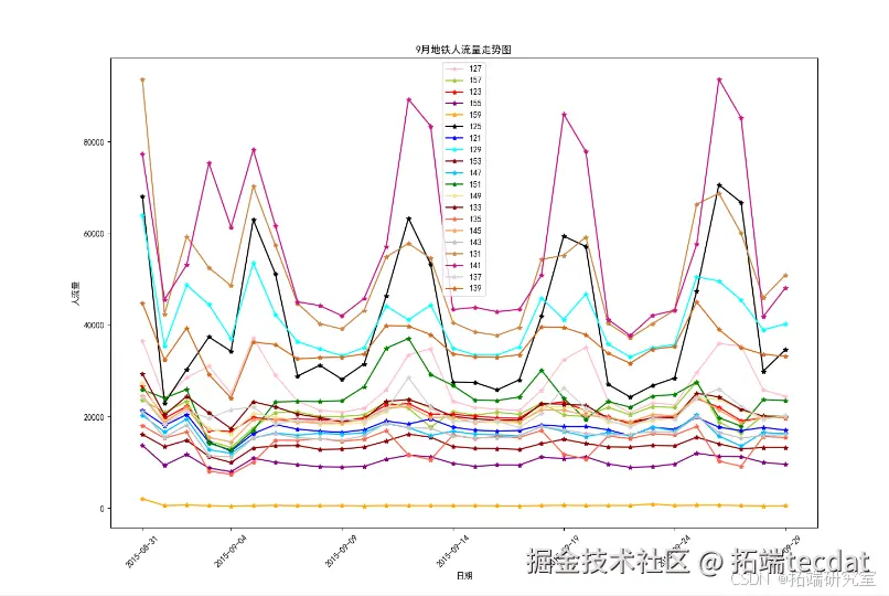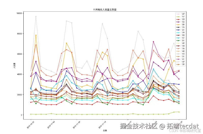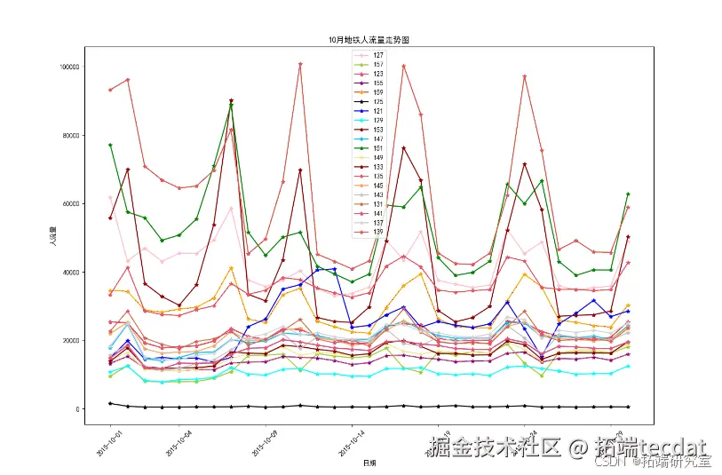 准备从 8 月到 11 月的地铁人流量数据(四个 csv 文件)样本如下: