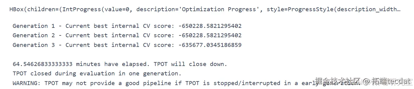 接着,我们初始化并训练了一个TPOTRegressor模型,设置最大运行时间为60分钟,以确保模型有足够的时间探索可能的解决方案。此外,我们将verbosity设置为2,以便在训练过程中获得详细的输出,并将n_jobs设置为-1,以利用所有可用的处理器核心。