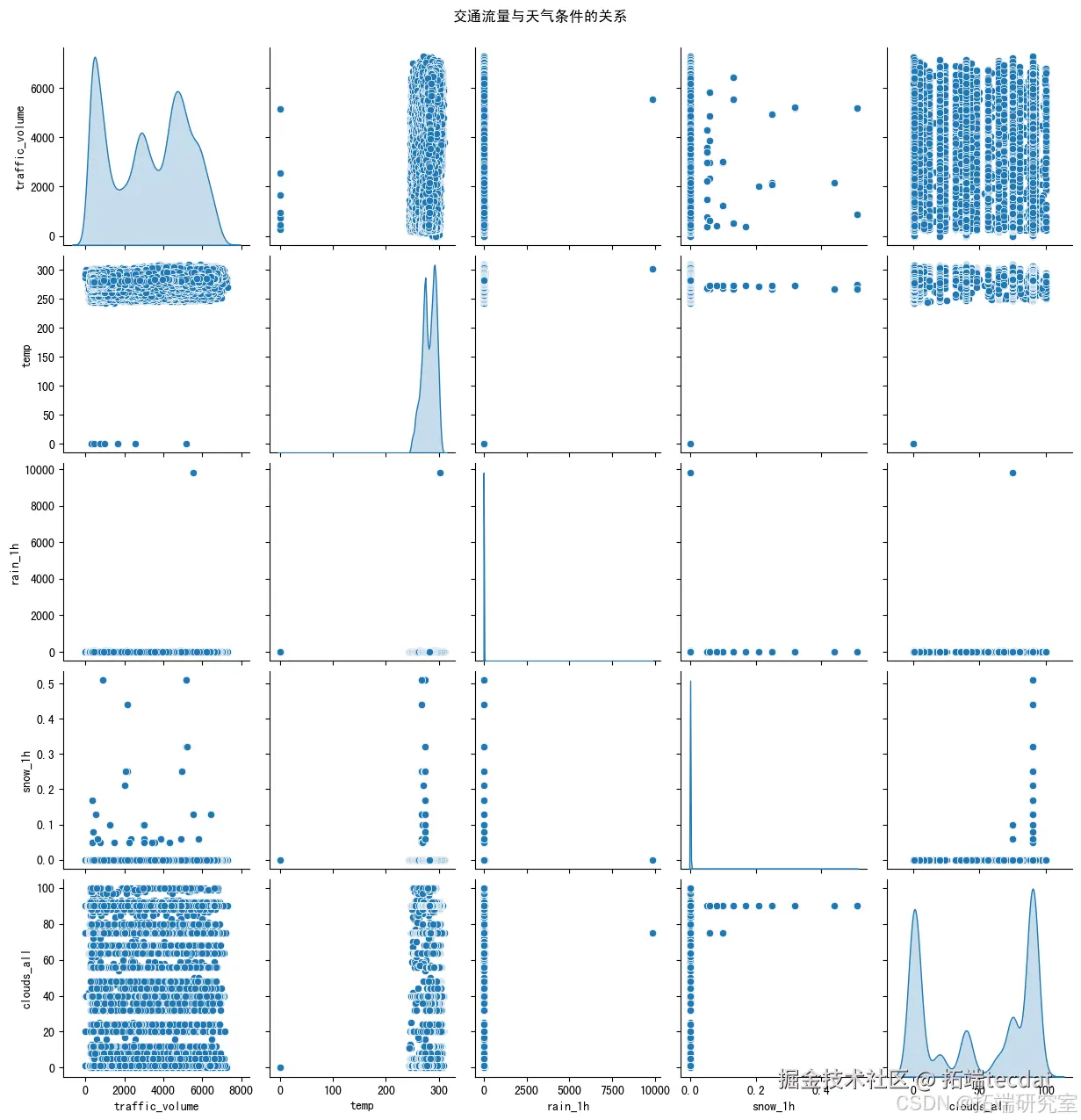 这是一个散点图矩阵,用于探索traffic_volume与weather_main、temp、rain_1h、snow_1h和clouds_all等变量之间的关系。