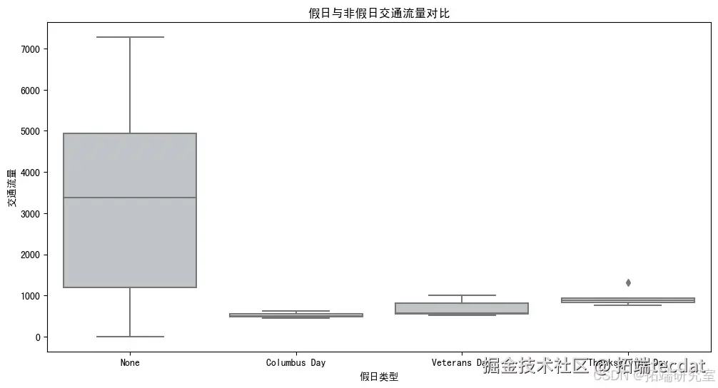 这是一个箱线图,用于比较holiday为“None”与特定假日(如Columbus Day, Veterans Day, Thanksgiving Day)的traffic_volume差异。