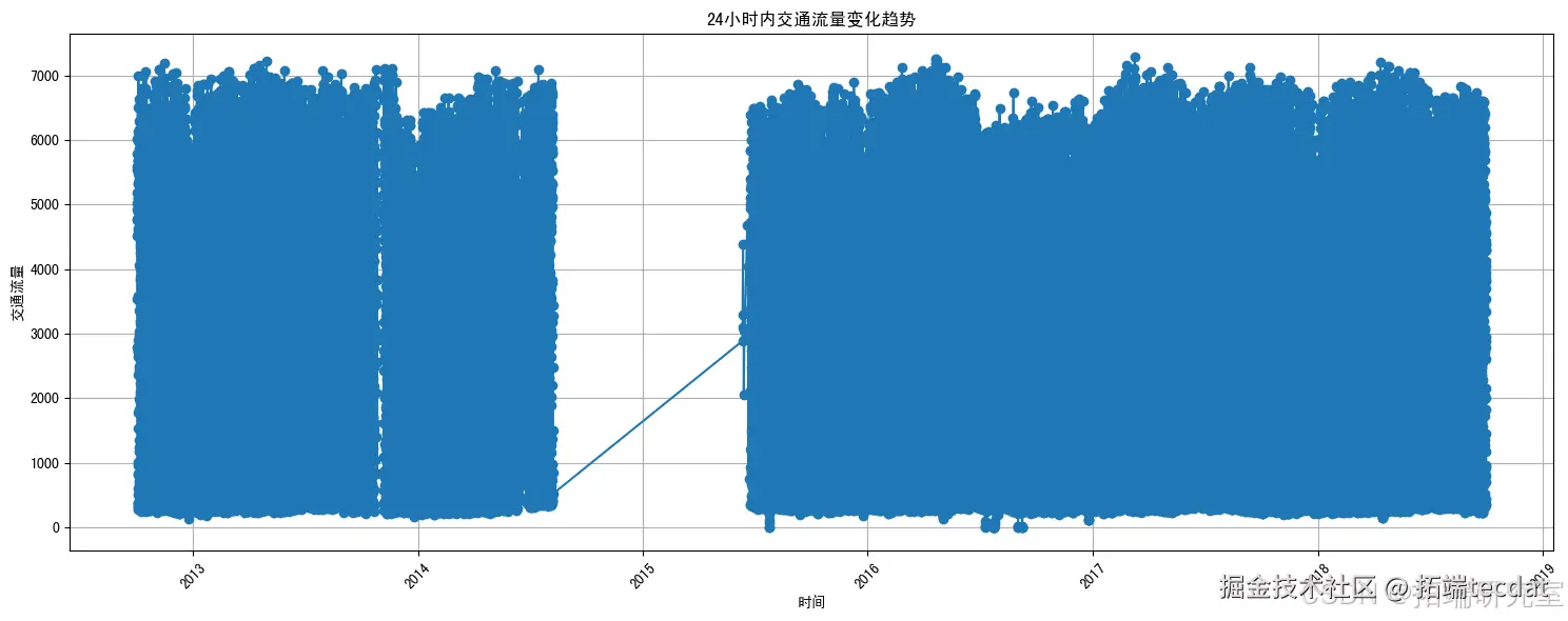 为了更准确地展示24小时内的交通流量变化趋势,我需要先筛选出特定日期的数据。然后,我将再次绘制折线图。