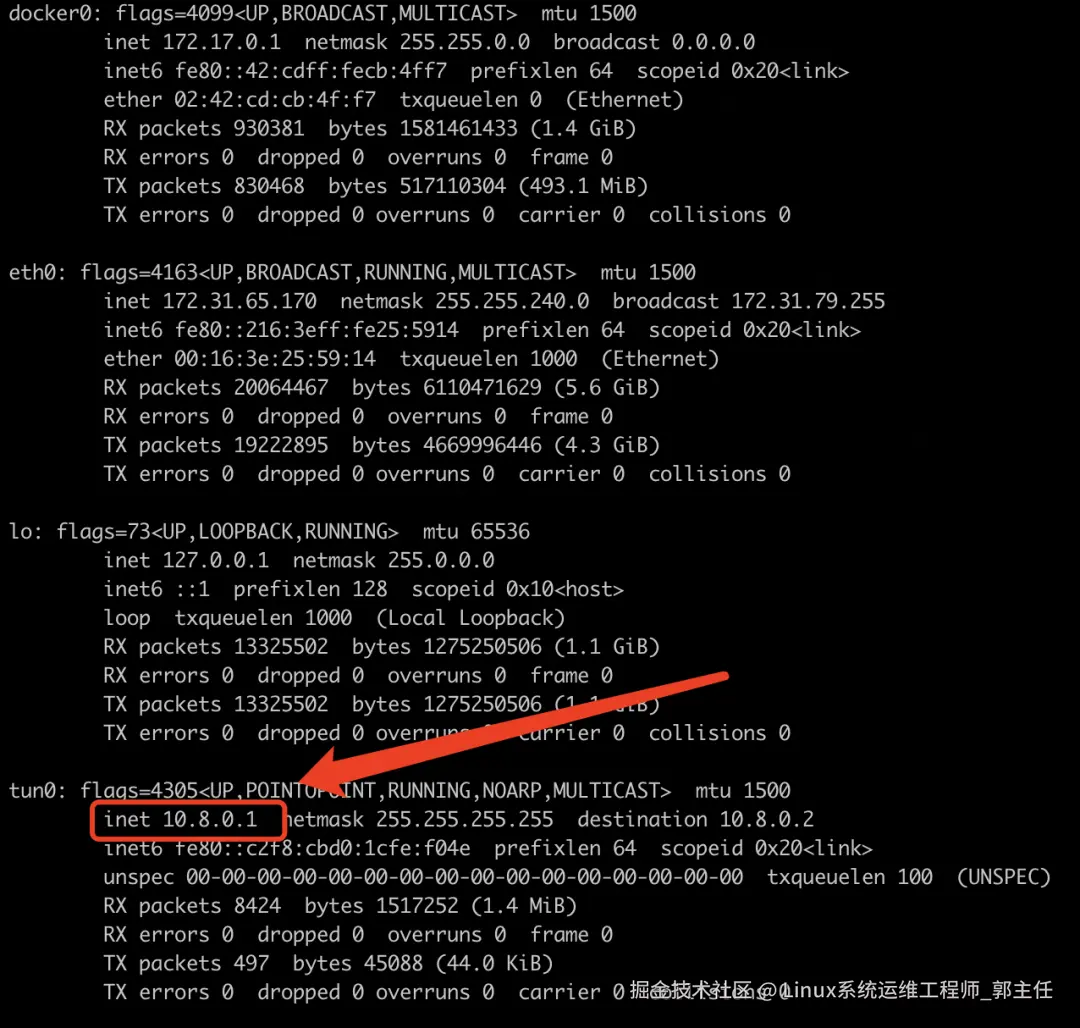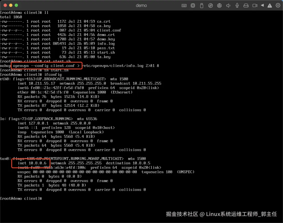 到这里我们的服务端就搭建好了,使用ifconfig可以看到我们的服务端已经给自己分配了一个10.8.0.1的虚拟IP