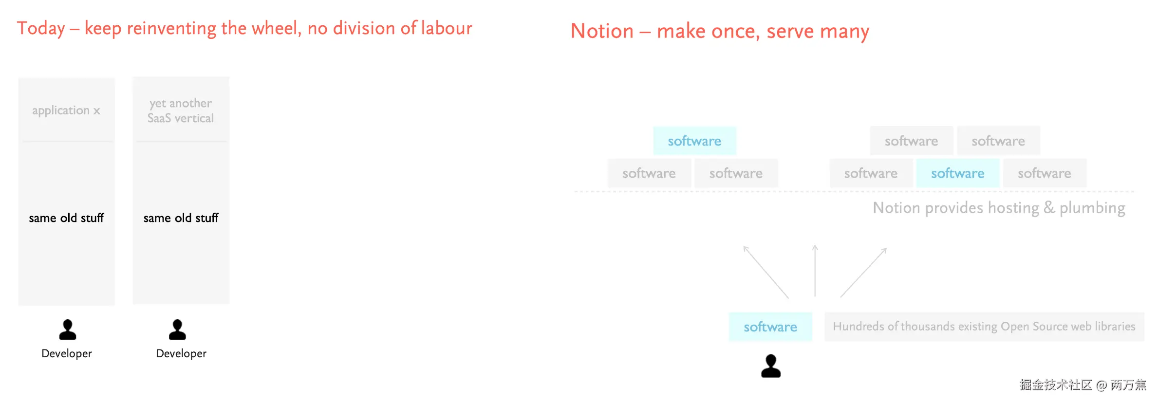 - 在 Notion 之前,开发人员在不同的应用之间,不断地重复相同的工作