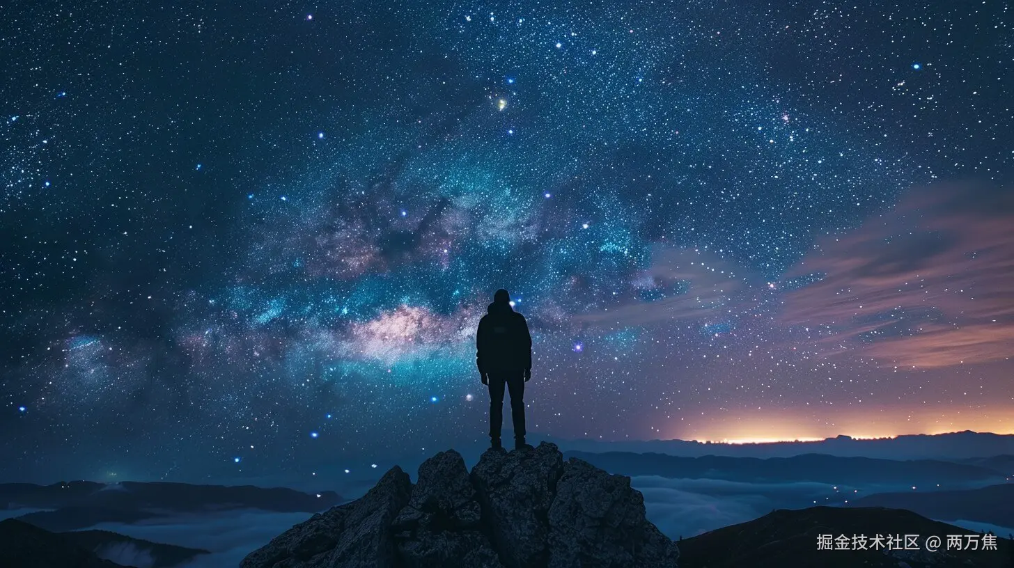 prompt: Under the infinite canvas of the nocturnal sky, a solitary figure is silhouetted against the cosmic splendor of the Milky Way. Perched on a rugged peak, the individual is immersed in the tranquility of nature, contemplating the vastness above. The celestial display of countless stars and the brilliance of the galaxy stretch into the distance, while the horizon glows softly with the last whispers of the sunset. This moment captures the sublime connection between humanity and the cosmos, a reverent pause in the majesty of the universe.