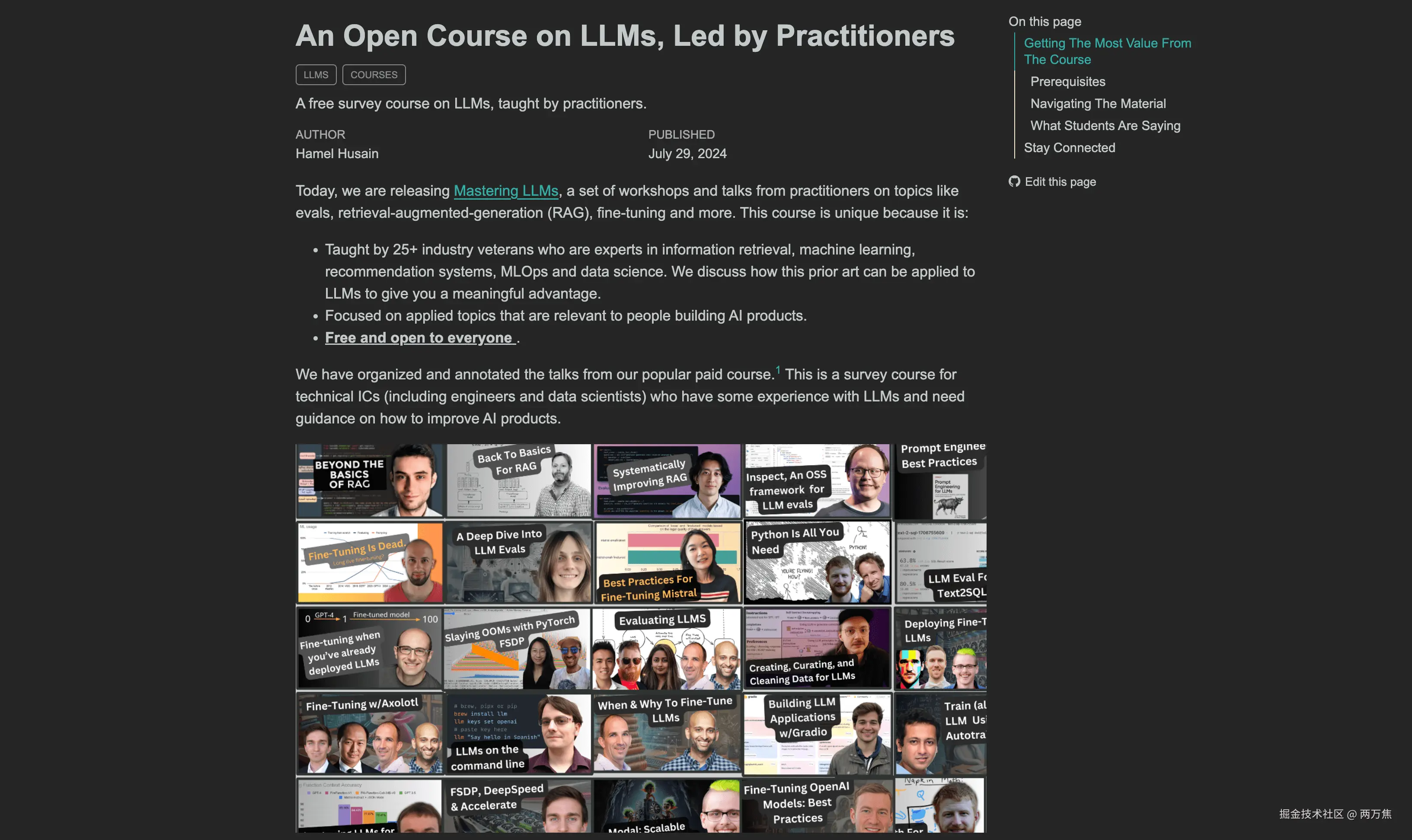 - Mastering LLMs:An Open Course on LLMs:一个由行业专家主讲的免费大型语言模型课程,课程内容涵盖评估、检索增强生成、微调等主题,适合小白入门