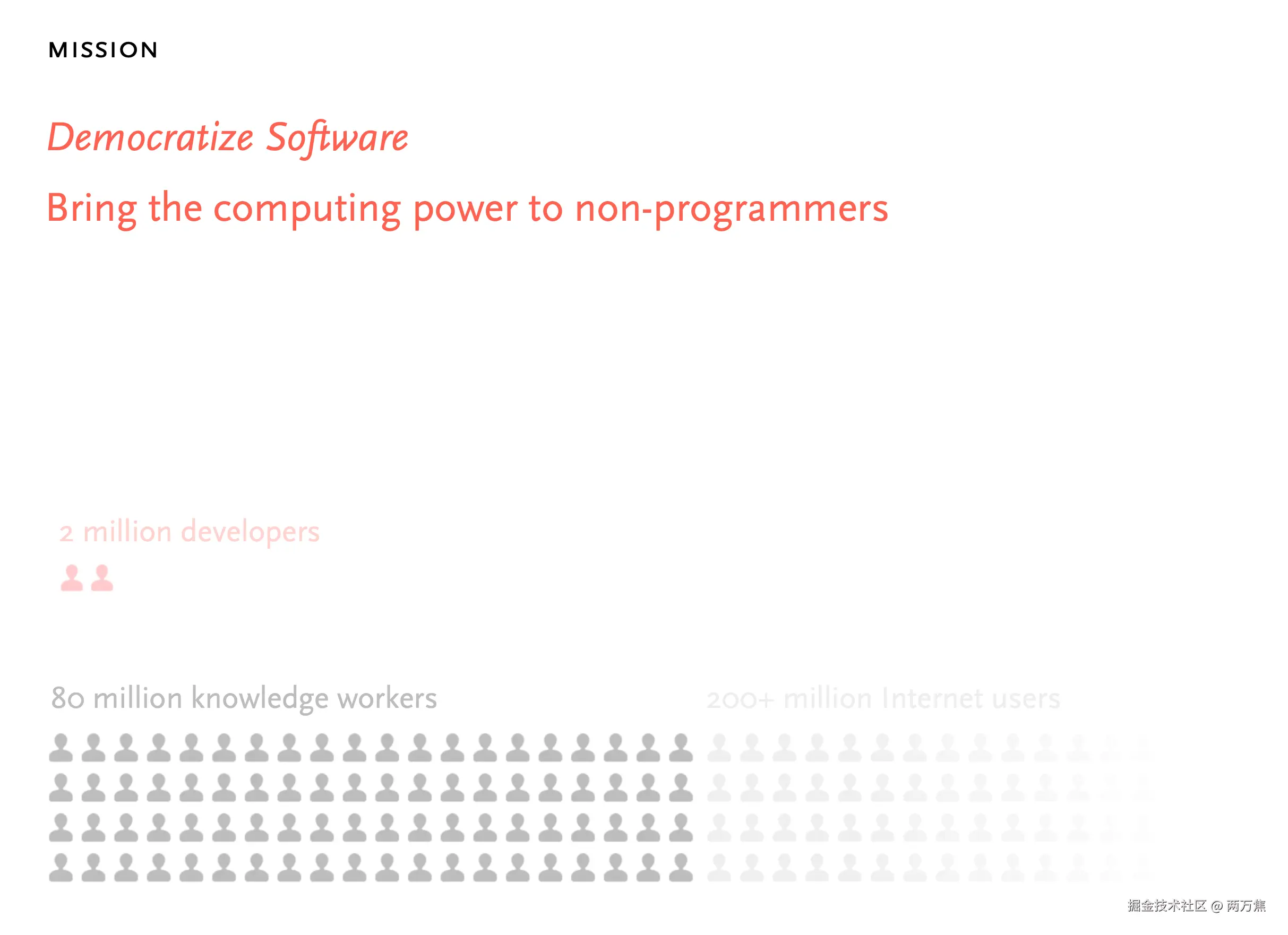 第二张是 Notion 的愿景:软件民主化,让非程序员也能够创建和定制软件应用,而不仅仅是使用现成的软件