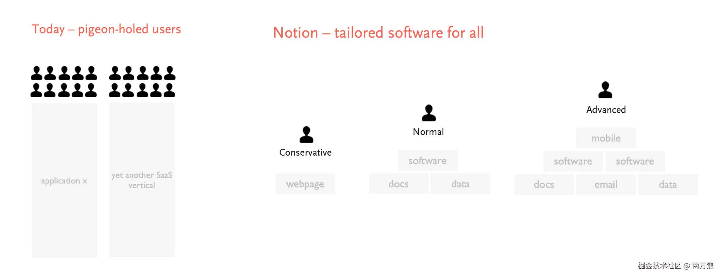 接下来的三张图,就是 Notion 对于如何实现“软件民主化”愿景的方式