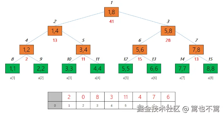 线段树是一棵二叉树,每个节点对应数组的一个区间。叶节点存储数组的单个元素,内部节点存储其子节点对应区间的聚合信息,如区间和、最小值或最大值。