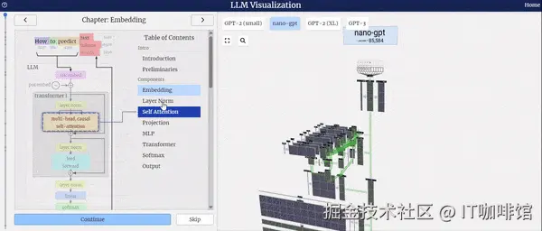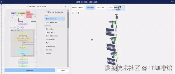 llm-viz使用界面的左侧是模型结构总览图,包括模型的整体架构以及构成模型的各个组件。