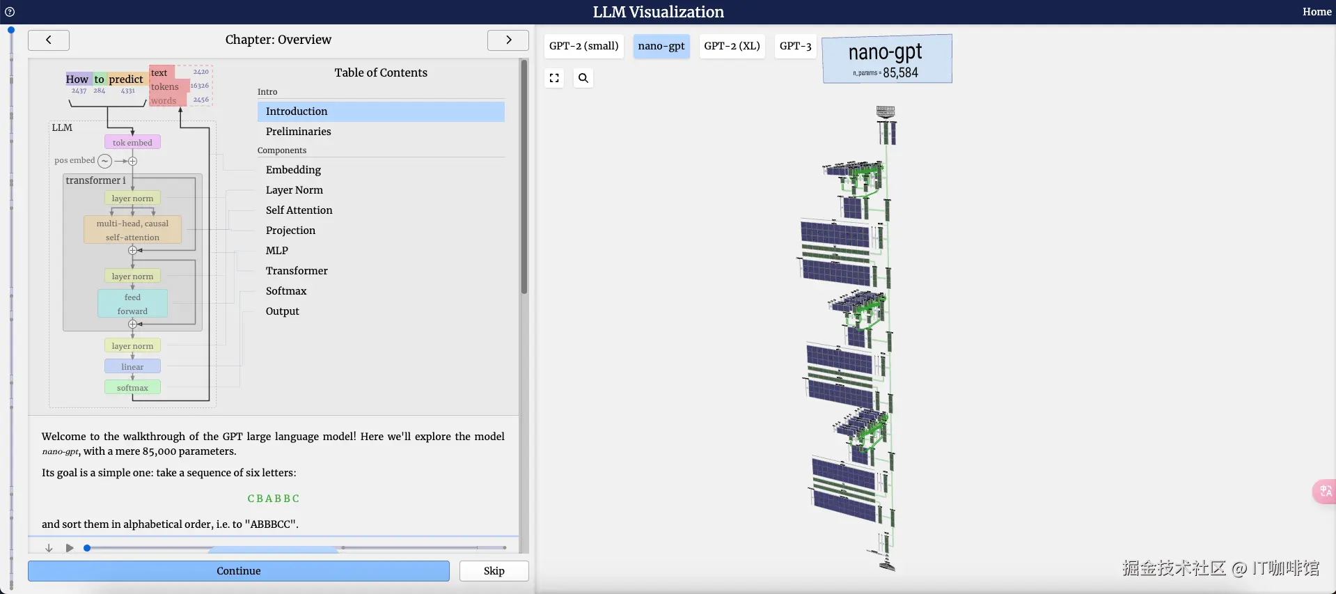 在这里的第一个示例里展示了nano-gpt模型的执行原理,演示它对字母 A、B 和 C 的小列表进行排序的过程。llm-viz 还支持可视化任意大小的模型,并且适用于较小的 gpt2 大小,因为更大的模型(比如GPT-3)需要处理和存储非常多的数据,所以这个项目没有包含这些大模型的全部数据。