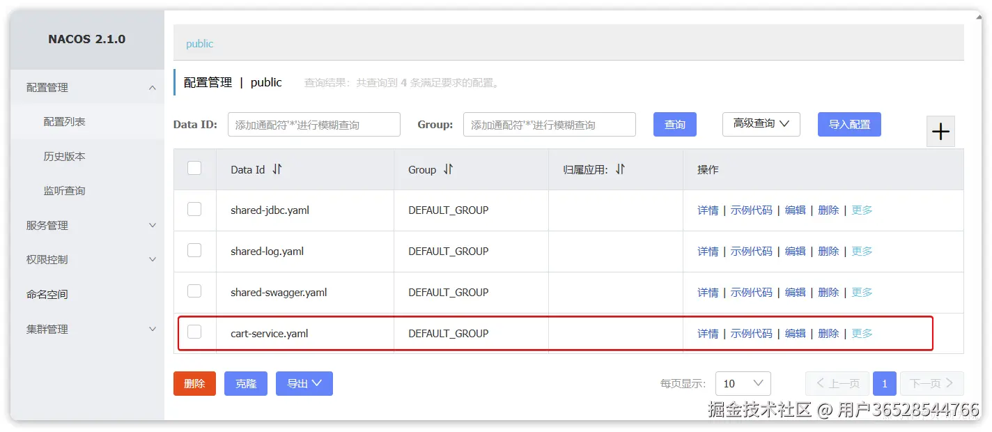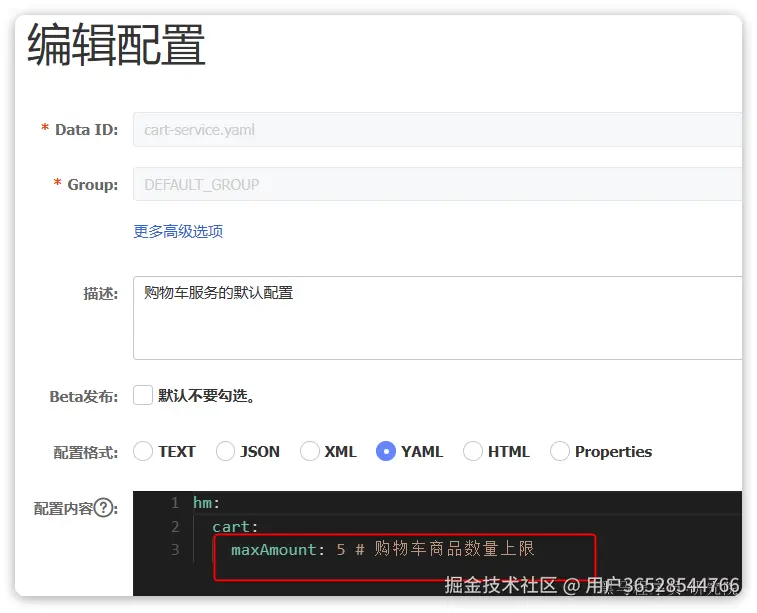 将来我们保存到Nacos的配置也要符合这个对象结构,将来我们以JSON来保存,格式如下: