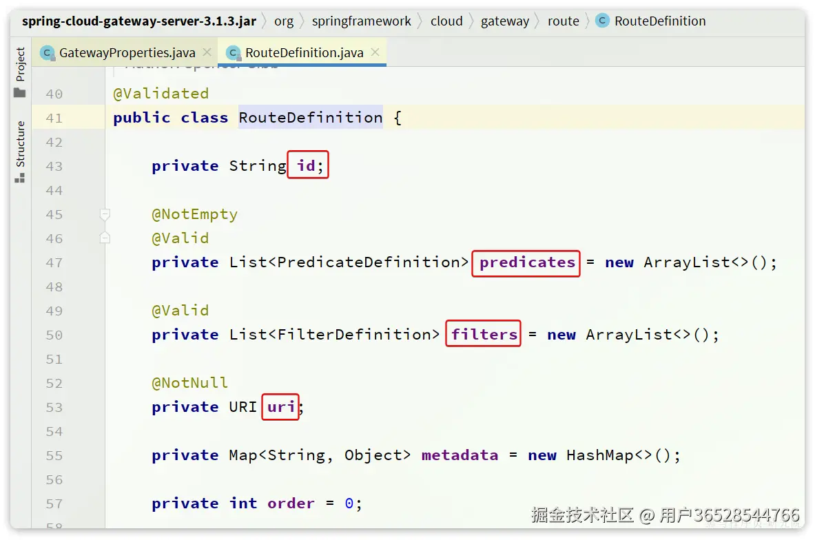 是一个集合,也就是说可以定义很多路由规则。集合中的RouteDefinition就是具体的路由规则定义,其中常见的属性如下: