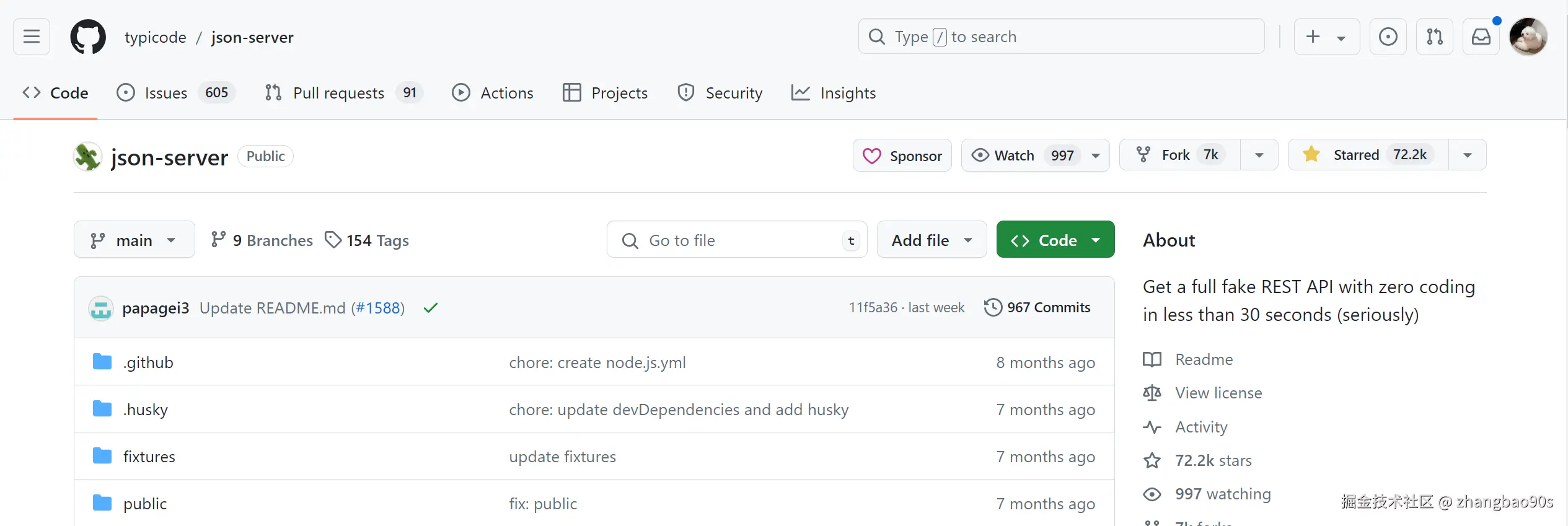安装完 json-server 依赖后,你只需要提供一个 db.json 文件,就能拥有一个功能完善的 REST API 资源服务。非常适合 Mock 数据服务的搭建和处理工作。目前已在 Github 上收获超 72.2k 颗星了。