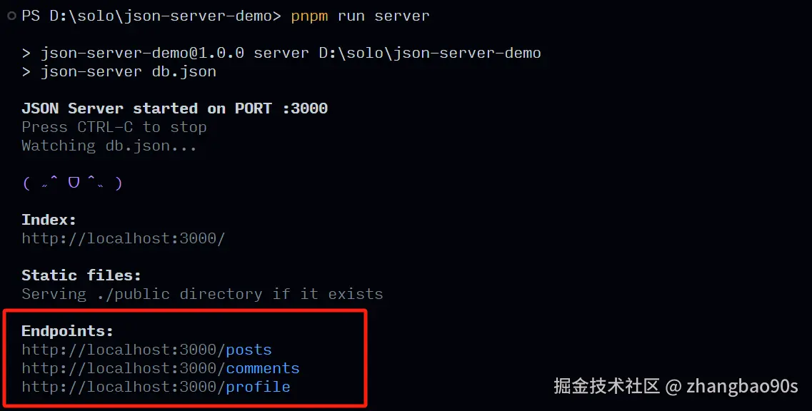 可以看到 db.json 中的 3 个终端资源分别映射成了 3 个终端路由:/posts、/comments、/profile。接下来,我们就可以针对这 3 个终端路由进行 CURL(增删改查了)了。