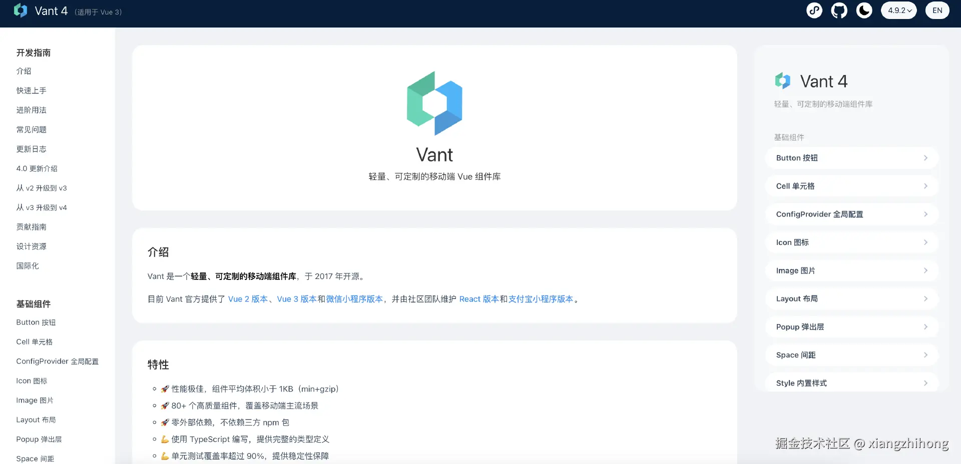 作为移动端组件库占有率最大的组件库, vant 组件库一直处于更新迭代中,社区生态十分丰富,社区的开发维护也非常活跃,是移动端组件库选型的不二之选。