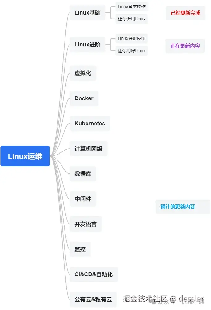 作者介绍:简历上没有一个精通的运维工程师。希望大家多多关注作者,下面的思维导图也是预计更新的内容和当前进度(不定时更新)。