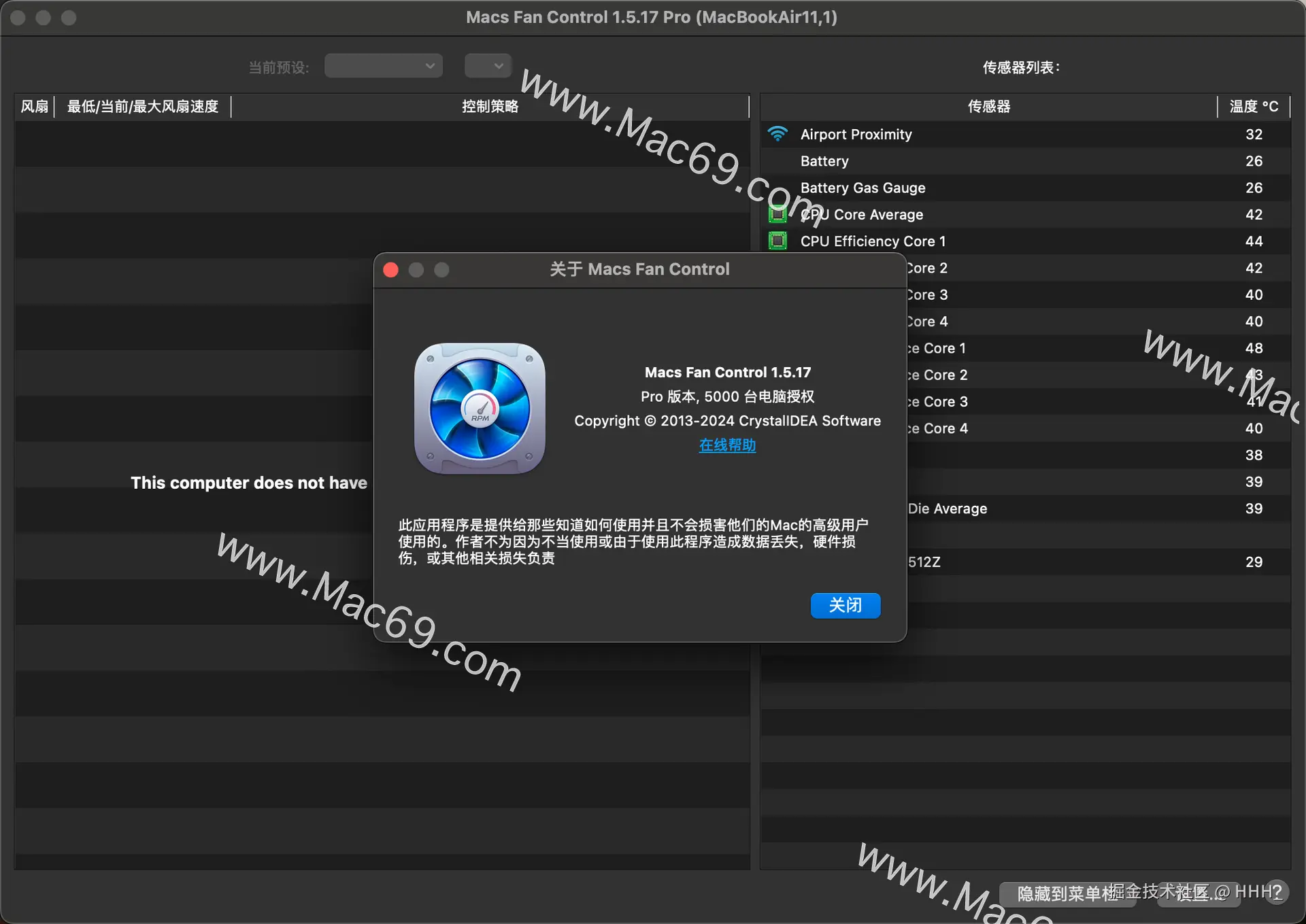 Macs Fan Control Pro Mac中文激活版是专为mac用户开发的一款Mac风扇控制系统,用户可以监控电脑中的显卡温度、以及风扇等等,可以帮你解决mac风扇噪音问题,解决mac发热问题,而且支持自定义风扇转速策略设置 ,非常好用!欢迎需要的朋友安装Macs Fan Control Pro中文激活版! 复制到浏览器打开即可:www.mac69.com/mac/8276.ht…