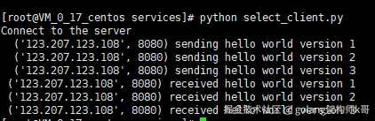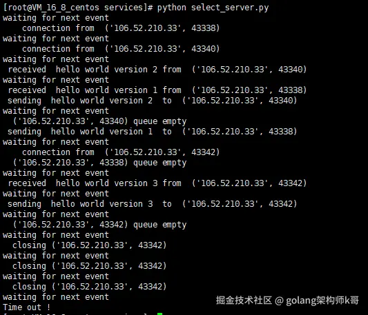 运行非阻塞服务端和两个客户端实例,结果如下图1.4所示,服务端接收两个连接请求。由于conn被设置为非阻塞socket,即使客户端并没有向服务端发送数据,conn.recv(1024)也会立即返回,不会阻塞,从而进程可以接收新的连接请求。