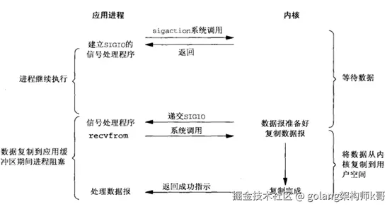 信号驱动式IO,当内核数据准备好时,发出信号,调用进程提前注册好的信号处理函数,但当存在多个socket操作时,无法分清是哪个socket准备好,因此实际应用中较少。